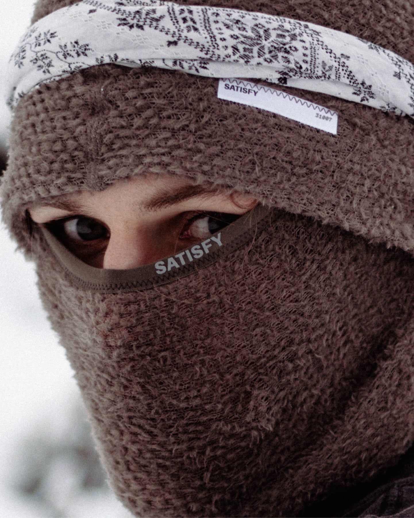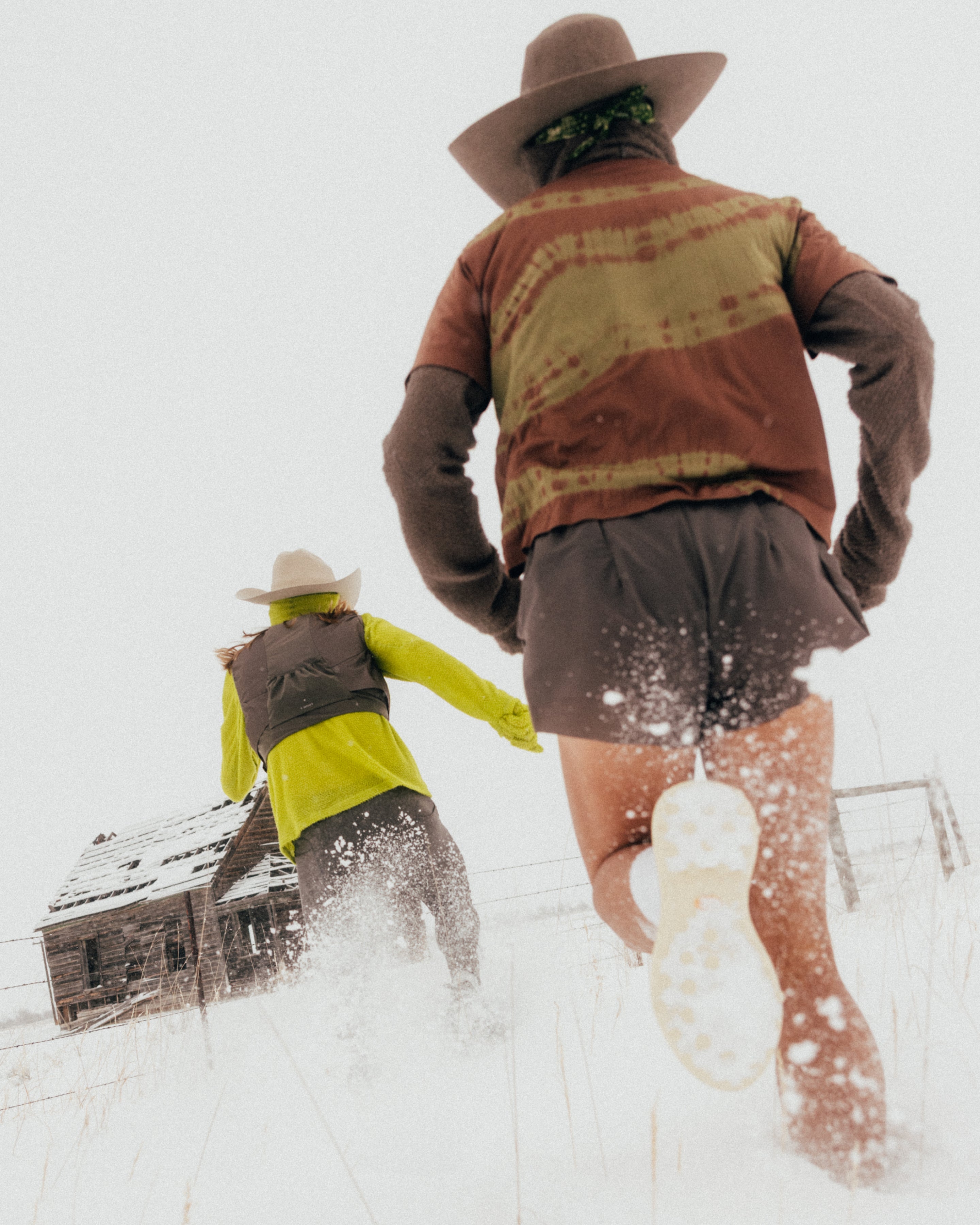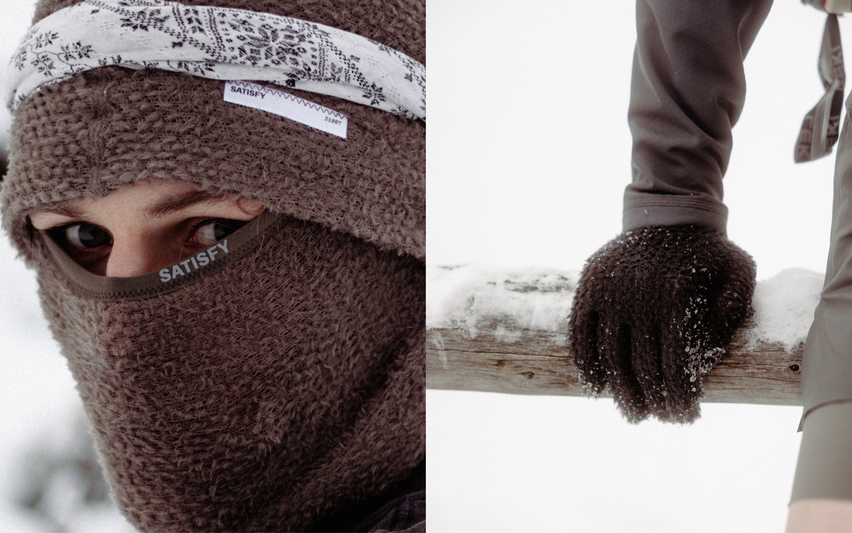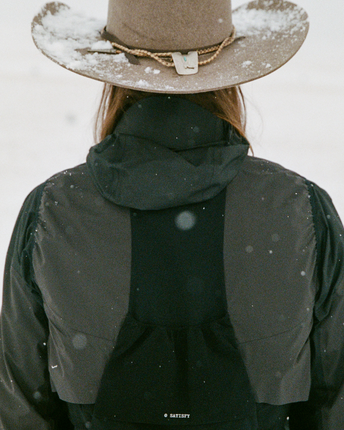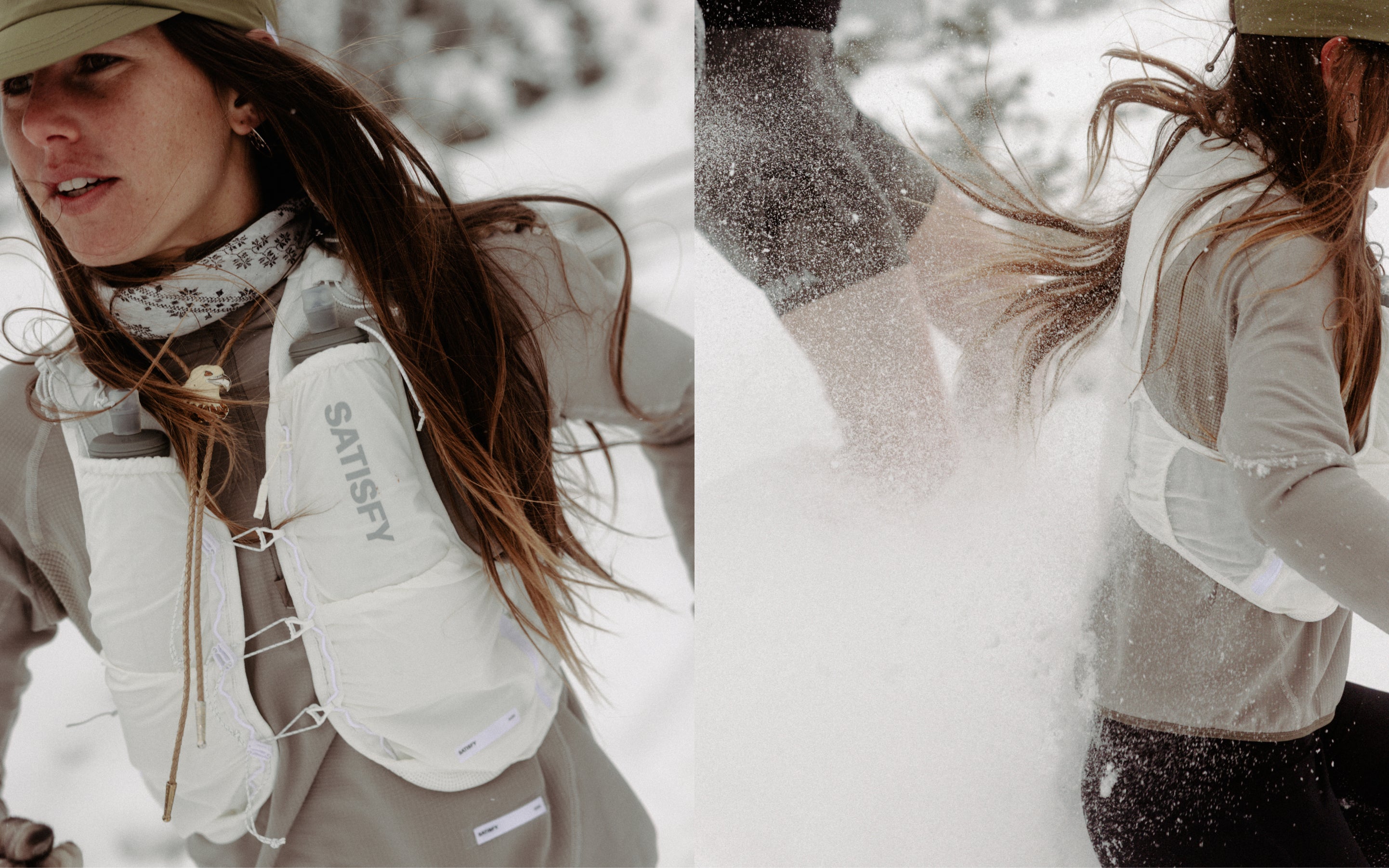 Tales from the North, edged with snowed-out trails, white-washed skies. Montana in winter. Here, SATISFY Pro Athletes Cat Bradley and Stian Sommerseth move through frozen air, each stride weighing protection and release. Endurance tested in the chase for warmth and peace amid the cold.