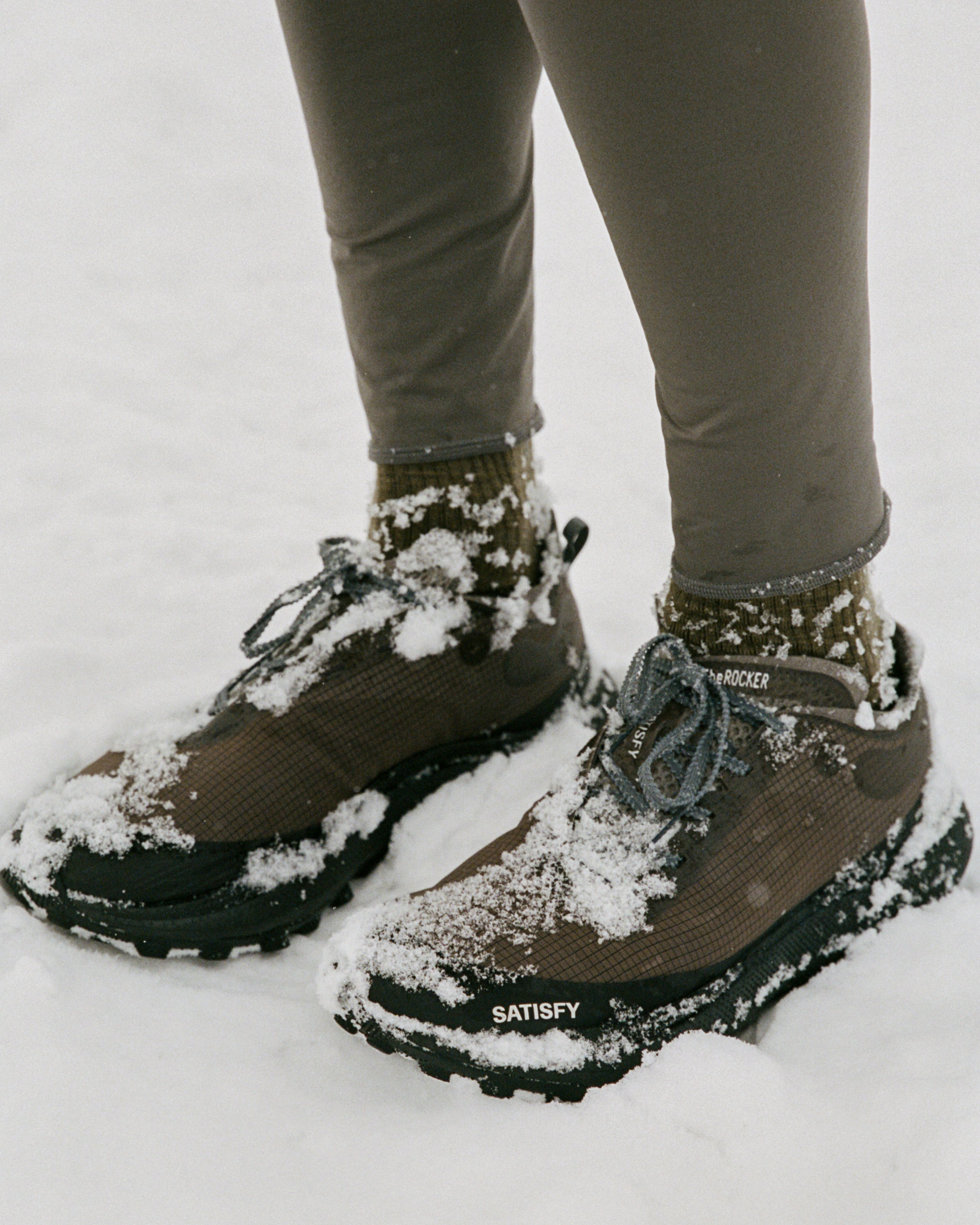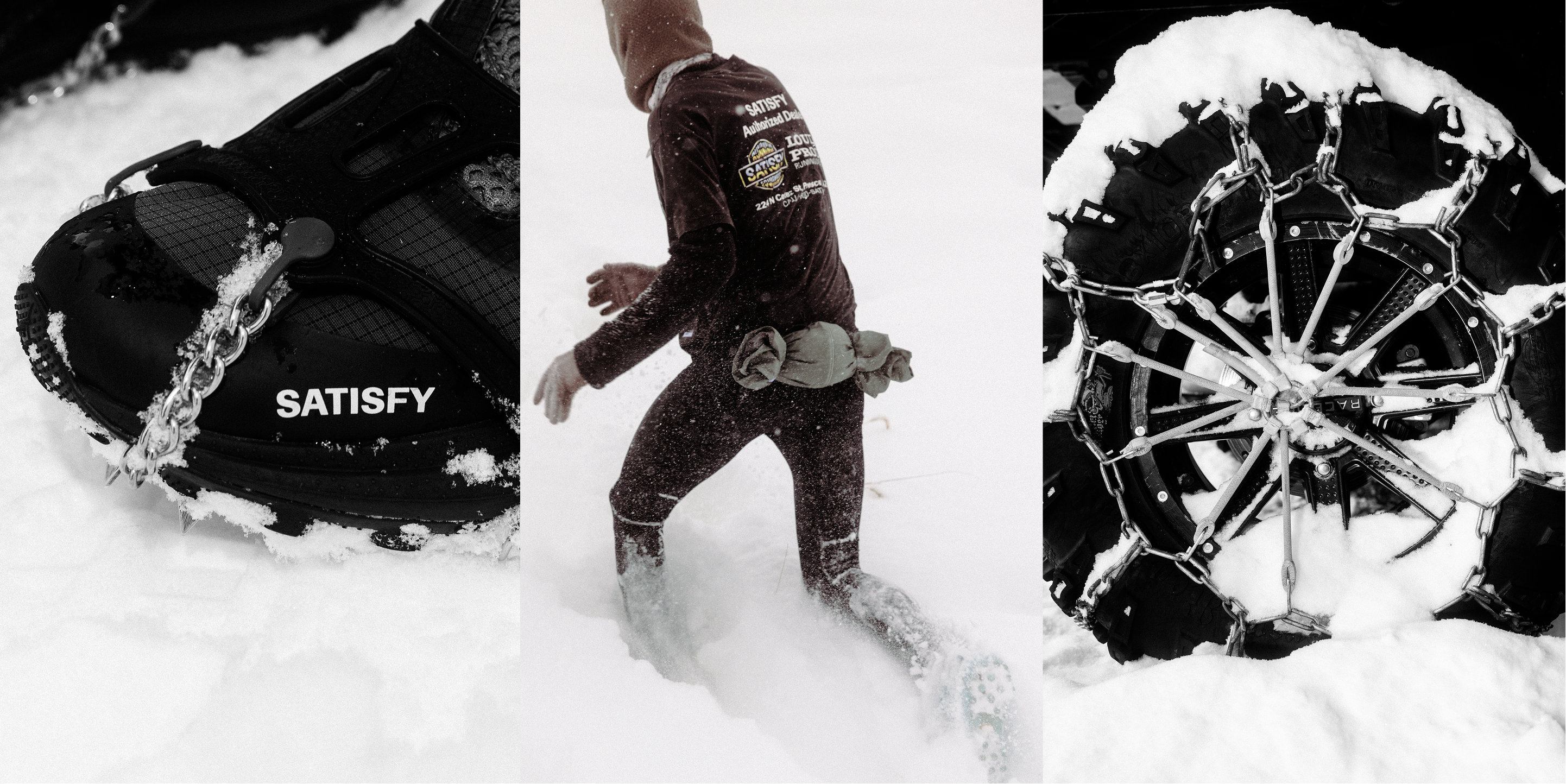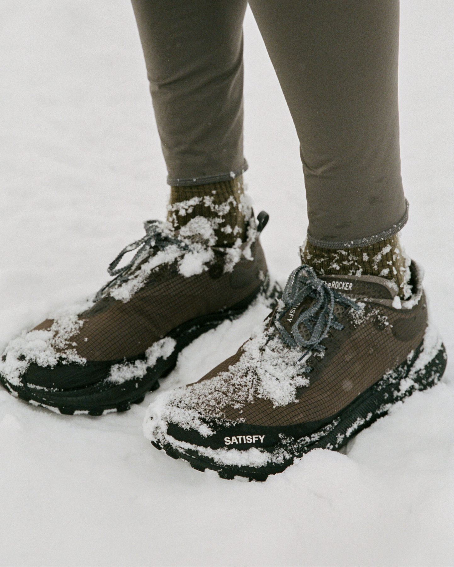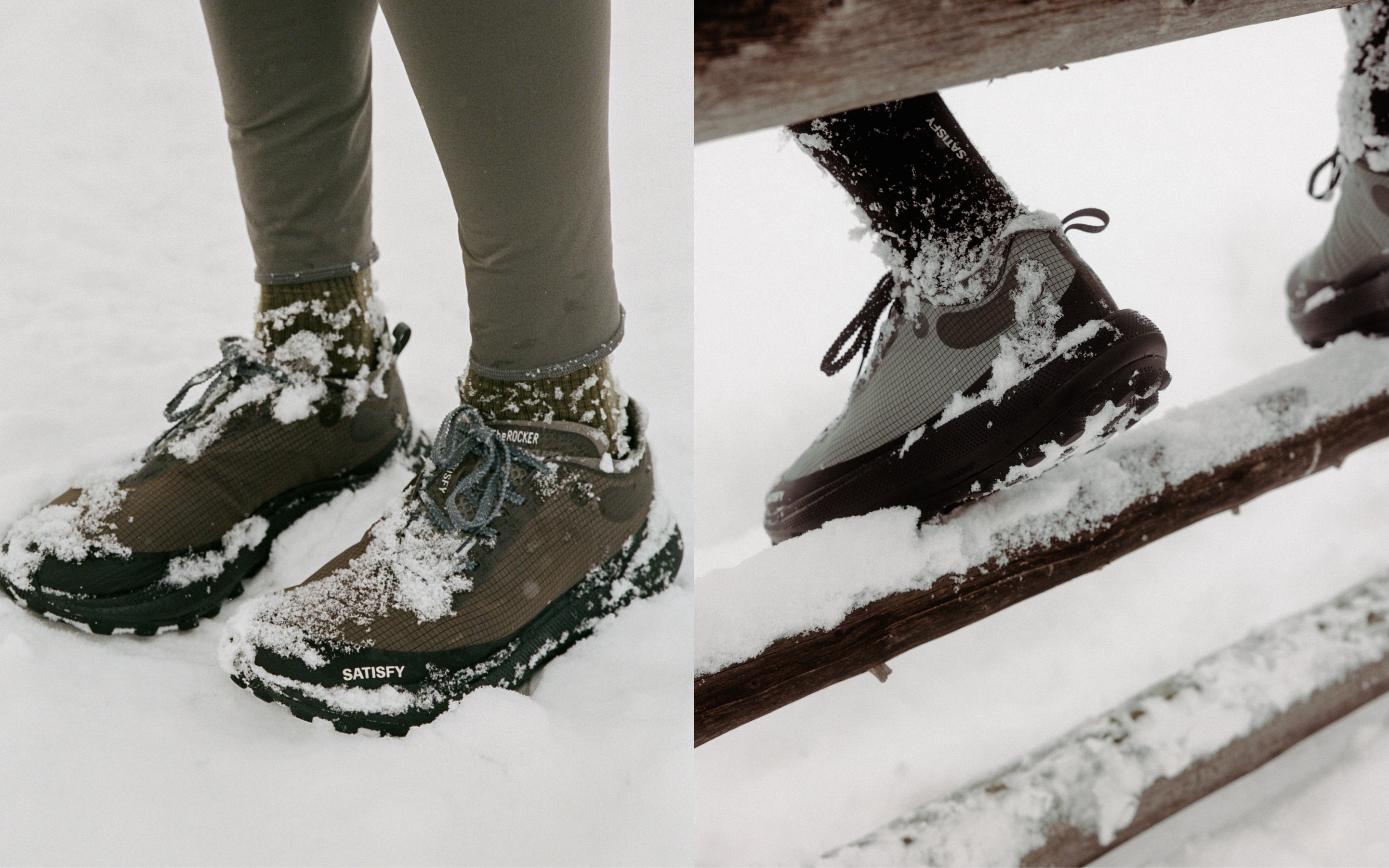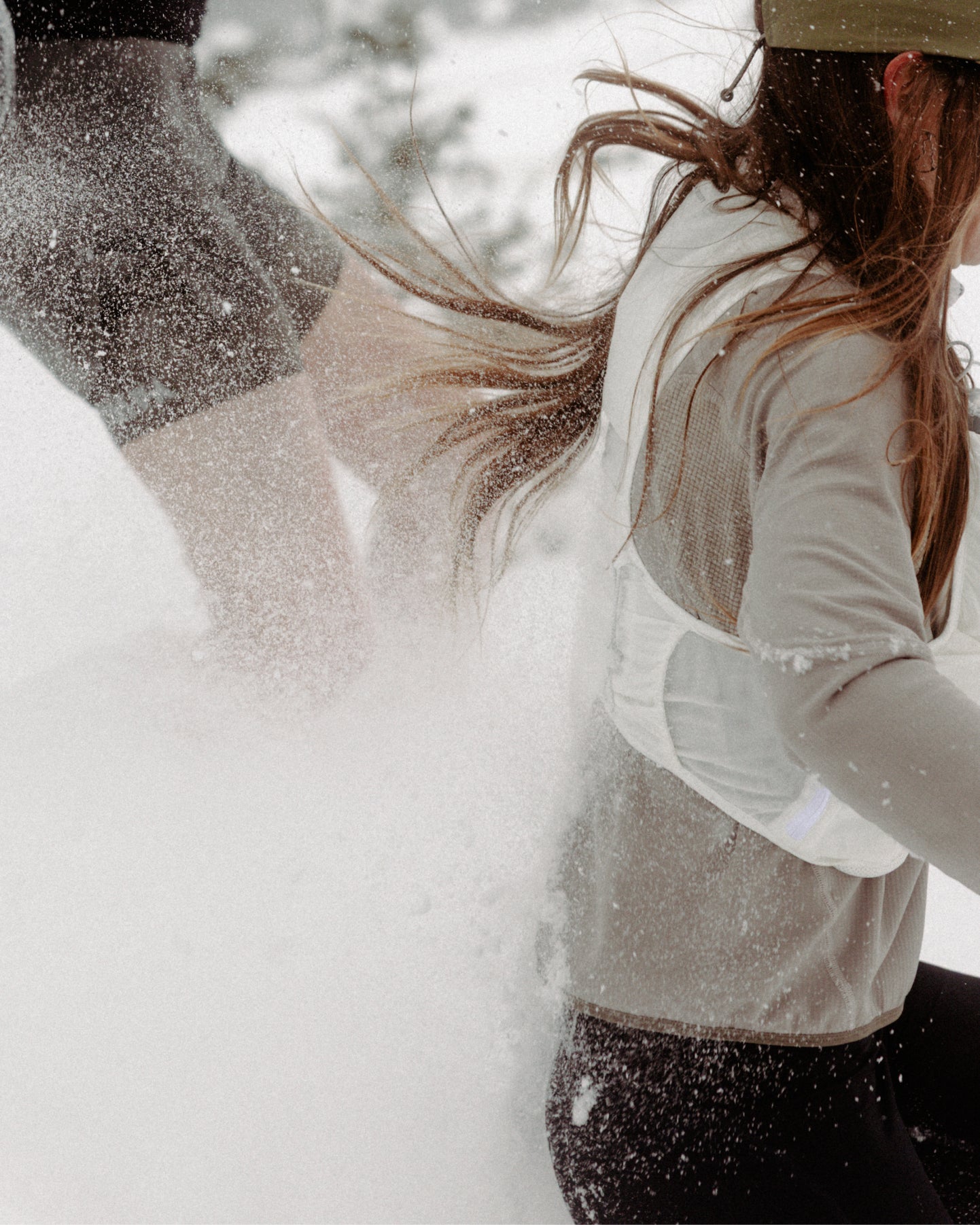 Tales from the North, edged with snowed-out trails, white-washed skies. Montana in winter. Here, SATISFY Pro Athletes Cat Bradley and Stian Sommerseth move through frozen air, each stride weighing protection and release. Endurance tested in the chase for warmth and peace amid the cold.