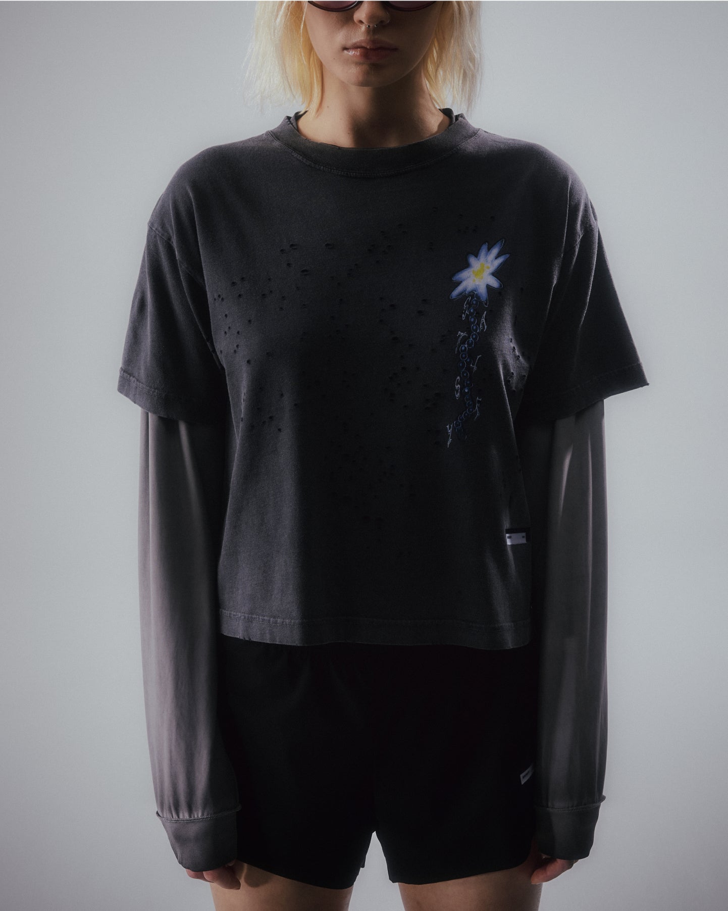 Organic cotton with body mapped perforations reshaped in a cropped cut. Breathable softness that releases heat and gets better with every wear.