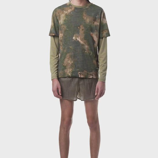 Raw hem construction across the bottom and arms of the garment for a lighter weight and frictionless experience.