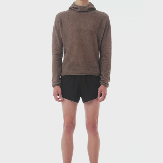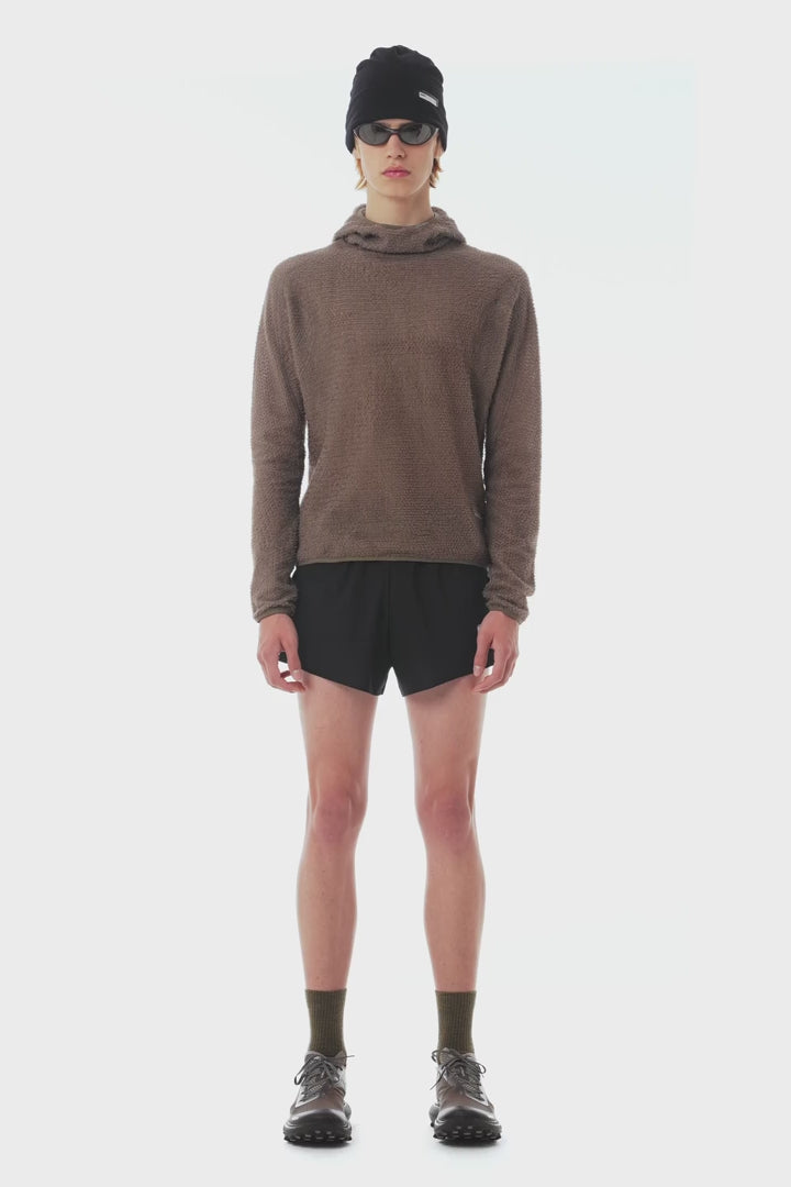 Lofted fibers stand exposed, retaining warmth in their structure. Breathable, no-bulk insulation. Beneath, an open mesh core channels heat away, leaving comfort steady in motion.