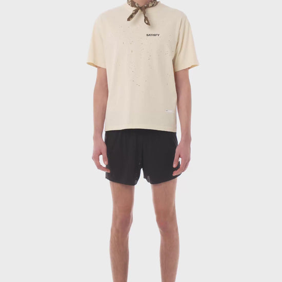 The SATISFY logo, worn close to the heart. Rendered in puffy ink.