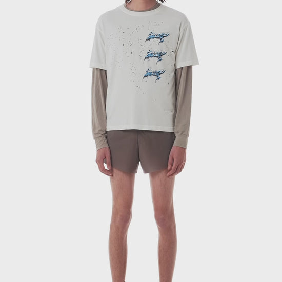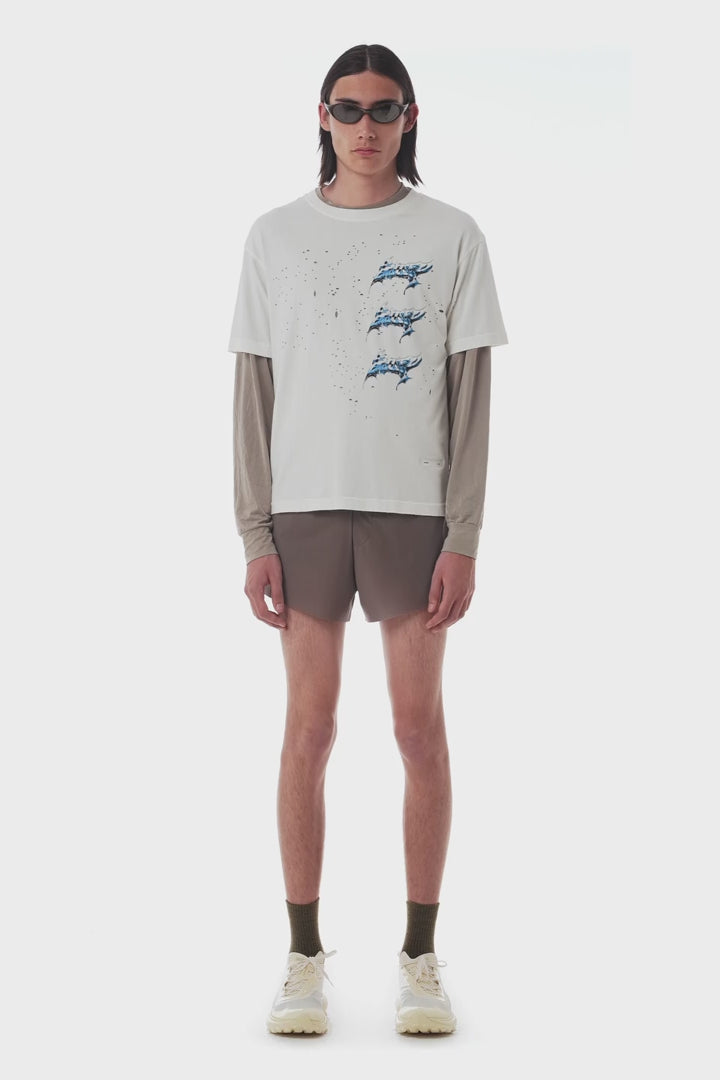 When distance builds, effort shows. Heat escapes and the mind follows. 175 grams of organic cotton, aged and ventilated for exploration without distraction. It's OK to run in cotton.